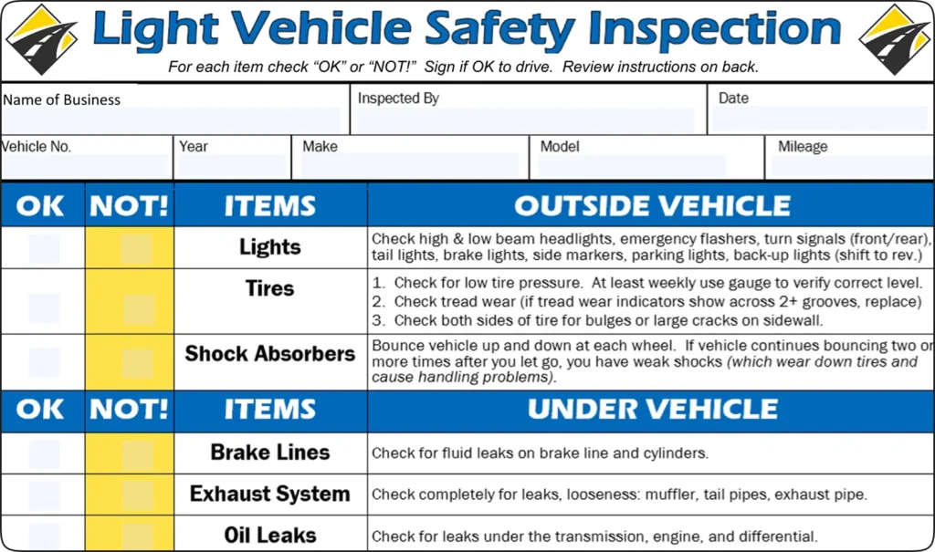 Our simple, two-page inspection form helps you catch problems early - before they lead to expensive repairs or accidents.